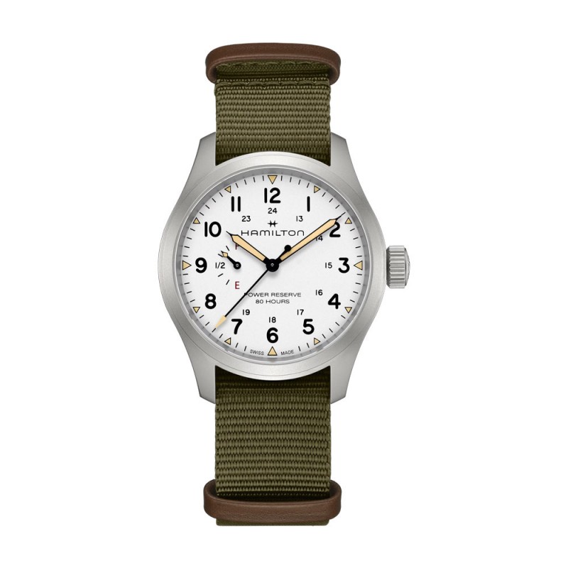 Il Khaki Field Mechanical Power Reserve 40 mm rende omaggio al design tradizionale e alla funzionalità essenziale della famiglia Khaki, introducendo al contempo caratteristiche moderne e le ultime novità in fatto di tecnologia e innovazione orologiere. Dotato di un nuovo movimento a carica manuale H-23, sviluppato da ETA in esclusiva per Hamilton, consente per la prima volta di visualizzare direttamente sul quadrante la riserva di carica di 80 ore. Abbinato a un robusto cinturino NATO verde khaki, il quadrante bianco mostra le diciture “power reserve 80 hours” (“riserva di carica di 80 ore”), “F” (completamente carico) ed “E” (scarico), sottolineando questa caratteristica funzionale d’eccezione.